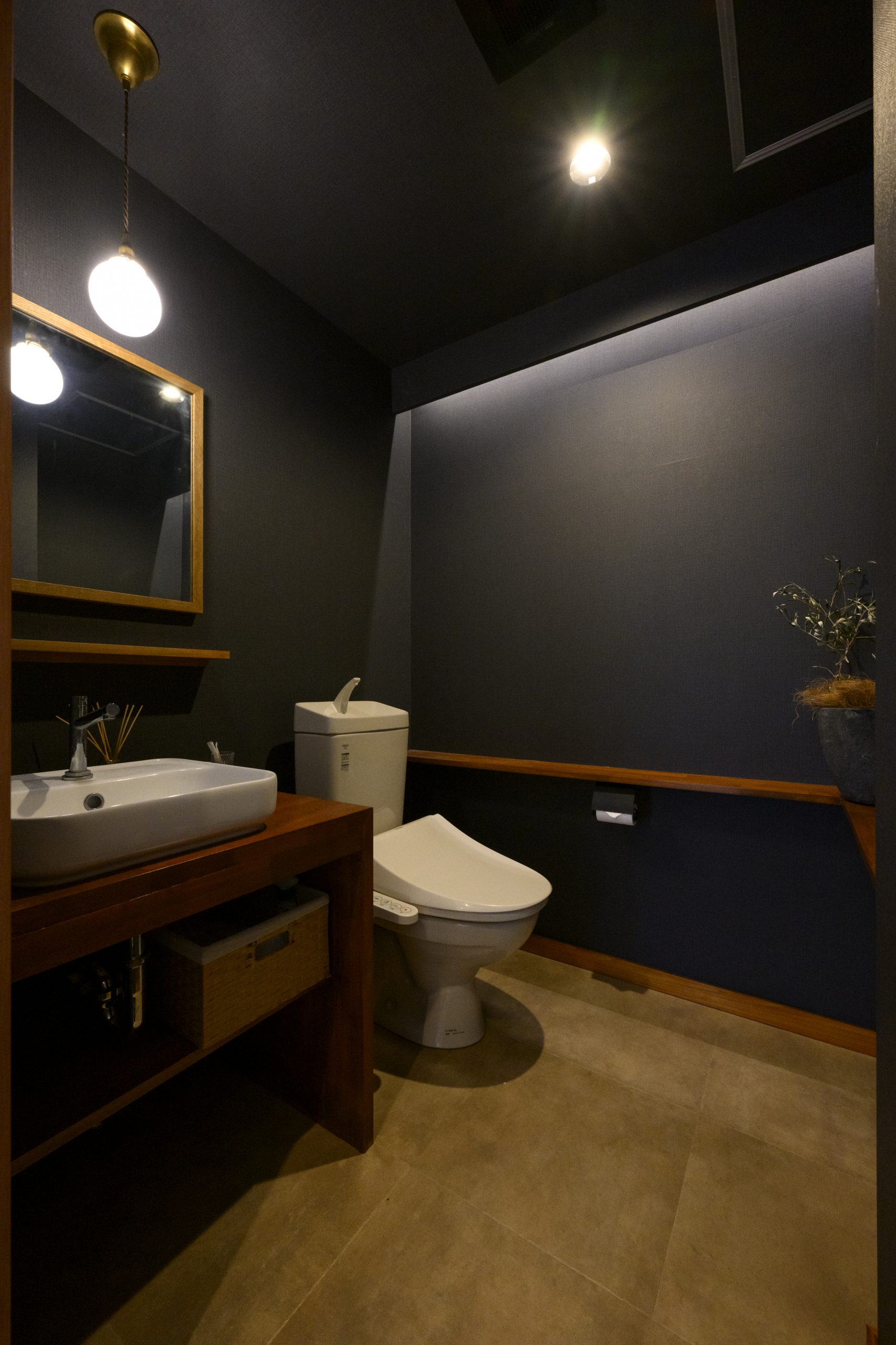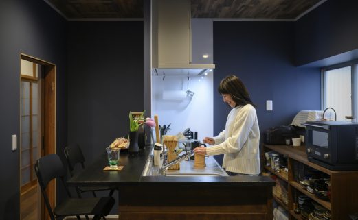 カウンターの裏側には機能的な収納スペースを配置することで